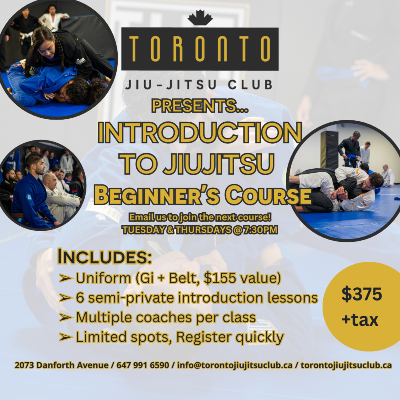 This course is 3 weeks long, offering 6 classes (Weekly on Tuesday's and Thursday's at 7:30pm) to make sure that any beginner will finish capable of joining a regular jiujitsu basics class with confidence.